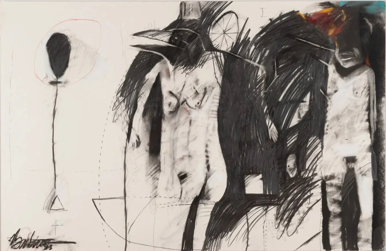 Rick Bartow’s boat carries figures caught in transformation. Human and animal forms merge without clear hierarchy. The drawing is physical – pastel pressed with restraint, graphite reworked. Bartow’s imagery is psychological but never abstracted from lived experience. The vessel reads as passage, burden, and reckoning simultaneously.