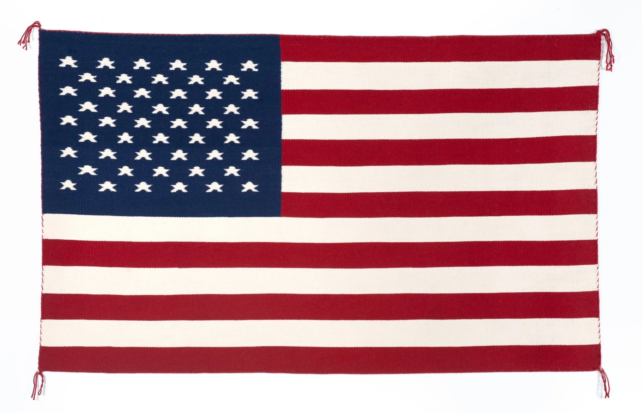 Bertha Harvey’s American flag holds its proportions with discipline. Stars remain measured, stripes deliberate. Yet this is unequivocally a Navajo textile – woven wool, tension held in structure, geometry carried through generational knowledge. The flag is neither altered nor caricatured. It is translated. In fiber, the national symbol becomes physical and enduring rather than rhetorical. The complexities of who created this artwork brings conversation around Nationhood to the forefront. The artwork lends itself to have an open-ended discourse about what it means to be American.