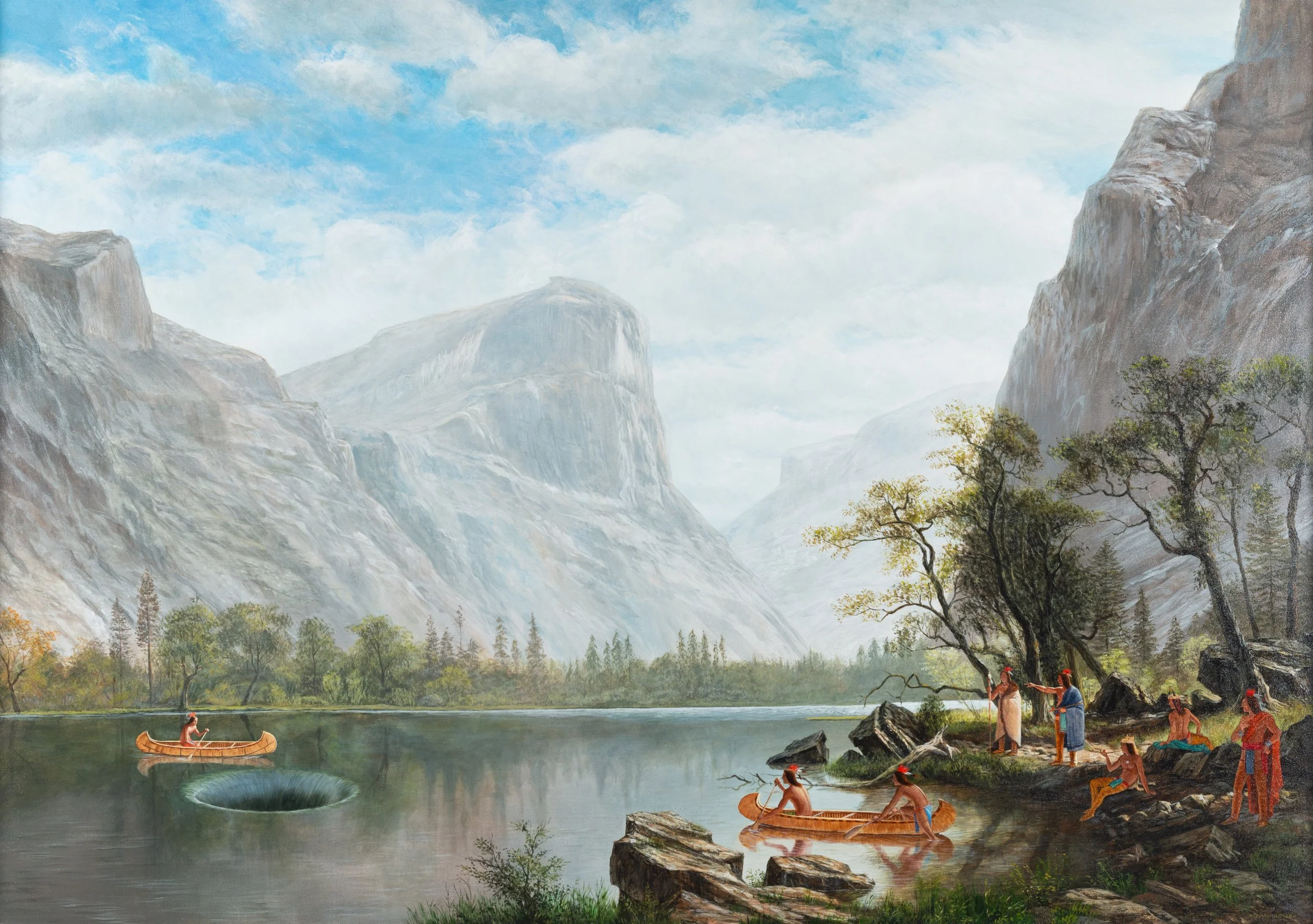 Monkman borrows the compositional language of Albert Bierstadt – sweeping landscape, luminous atmosphere, monumental scale – and intervenes directly within it. Indigenous figures appear in canoes across the water, not as incidental details but as active participants in the scene. The insertion is deliberate and corrective.