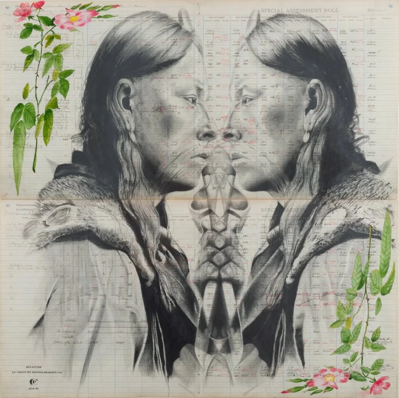 Pappan’s use of ledger paper is exact. The lined surface remains visible, its administrative history intact. Figures and marks overlay that ground without erasing it. The work acknowledges Plains ledger tradition while asserting contemporary authorship. Kinship here is structural rather than sentimental.