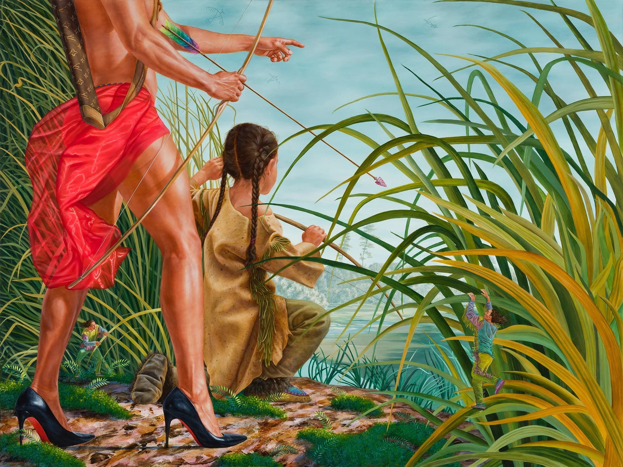 Kent Monkman stages an intimate yet monumental scene of instruction and presence. His gender-fluid alter ego, Miss Chief Eagle Testickle, stands poised in high heels and a vivid red garment, bow drawn, gesturing outward as a child crouches beside her in tall, enveloping grasses. Amid the shifting scale of the landscape, a small figure appears in the foreground—one of the mîmîkwîsiwak (the Little People), beings who, in Cree knowledge systems, have been here since before the oldest stories and who understand and honour the layers of memory held within the earth itself. Their presence folds spiritual time into the scene, suggesting that the transmission of knowledge extends beyond human generations into deeper cosmologies of land and story. Through hyperreal detail and subtle theatricality, Monkman reframes history not as absence or loss, but as enduring intelligence, relationality, and sovereignty.