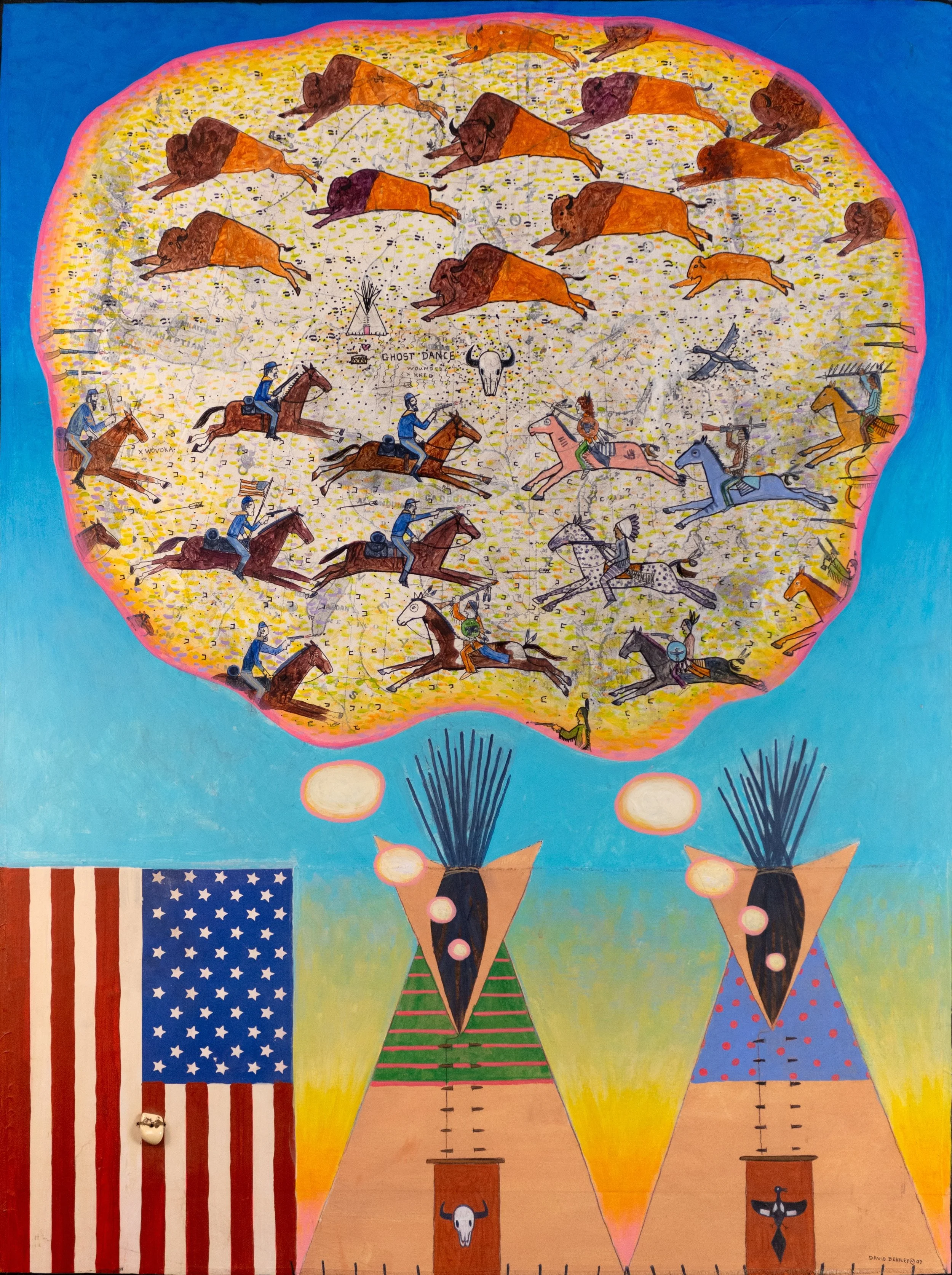 An inverted American flag occupies the lower left quadrant, a quiet signal of distress within an otherwise active scene. Two neighboring tribes—the Buffalo Clan and the Thunderbird Clan—sit in separate teepees, each contained within its own domain. Above them, Bradley introduces deliberately humorous thought bubbles: both envision the same outcome—a coordinated war against the U.S. Army advancing to slaughter the buffalo. The imagined battle plays out across a loosely rendered ledger-style map marked “Wounded Knee,” grounding the satire in historical reality. Bradley’s wit is sharp but measured; the humor carries the weight without exaggeration.