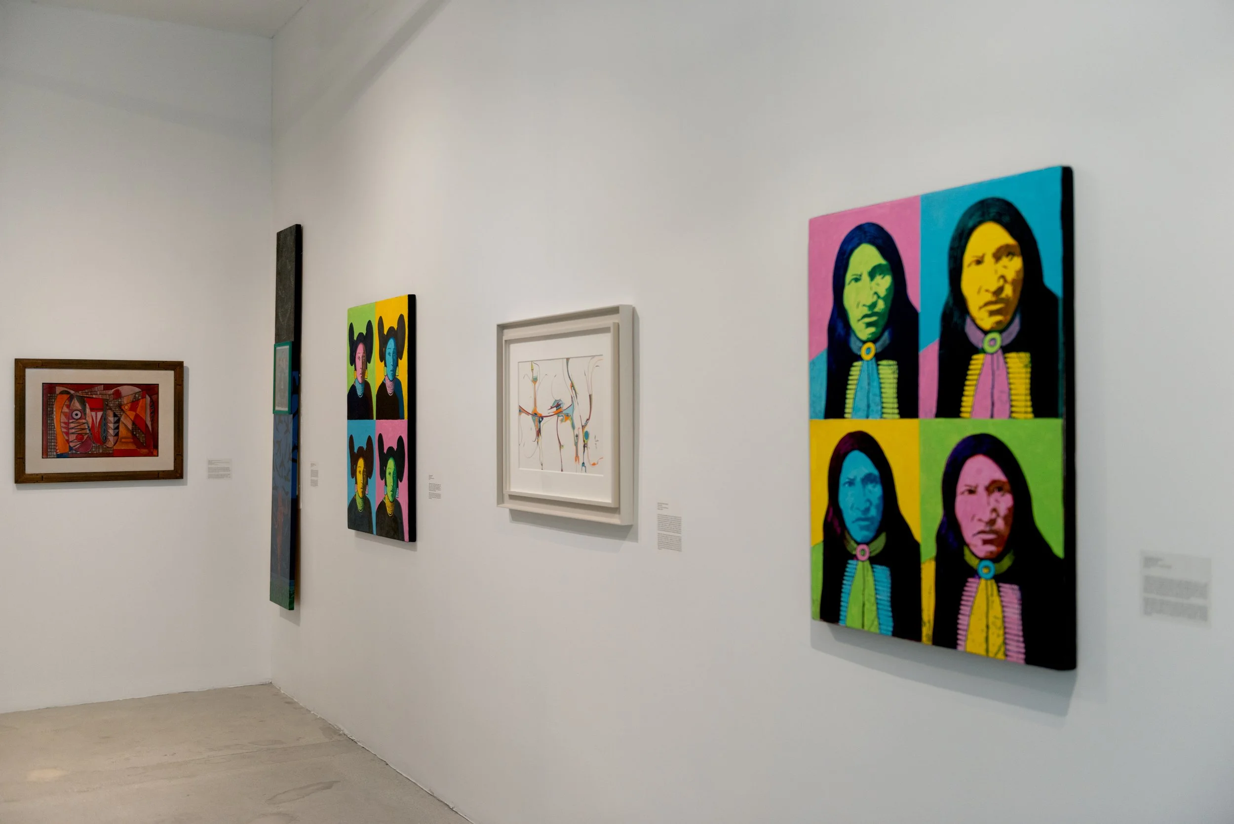 In Kicking Bear, David Bradley adopts the visual language of Pop Art – most notably the serial repetition and high-key palette associated with Andy Warhol – to interrogate how Indigenous leaders have been flattened into historical icons. The Lakota chief Kicking Bear appears four times, each iteration rendered in shifting fields of pink, blue, green and yellow. Face and sky trade colors across the quadrants, destabilizing any single, authoritative image.