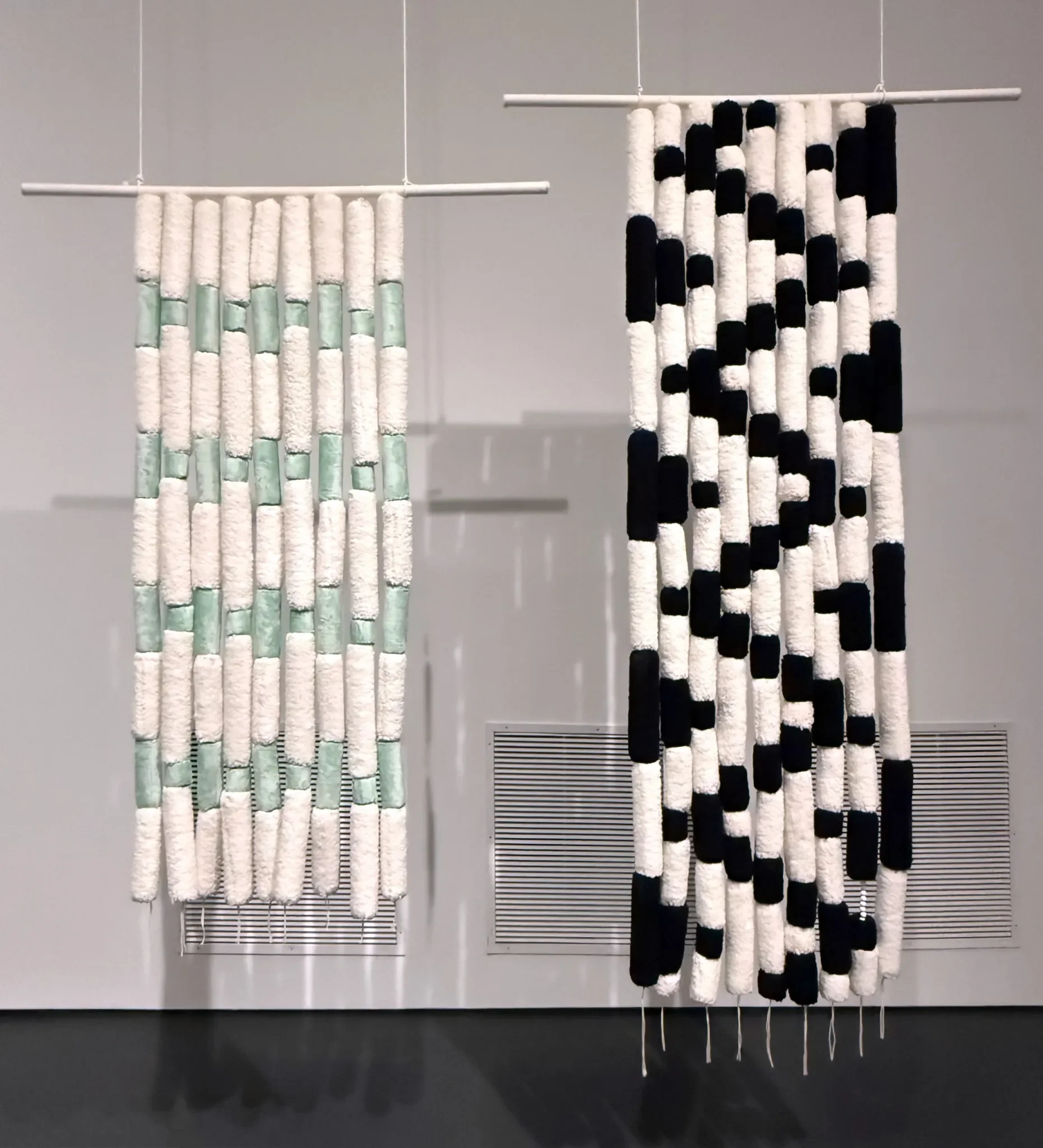 Sauntering from the humid Providence streets into Brown University’s David Winton Bell Gallery (the Bell), the cool contrast of Diné artist Eric-Paul Riege’s hyper-modern black, gray, and white palette will surprise you. But the coup de grâce for me, as a textile artist, is Riege’s employment of synthetic materials from retailers like Joann Fabrics and Amazon. The show’s curator, Thea Quiray Tagle, encouraged me to touch the works while expounding on the maintenance guidelines Riege provided — hairspray the fur and lint roll the orbs and discs made of wool and felt.