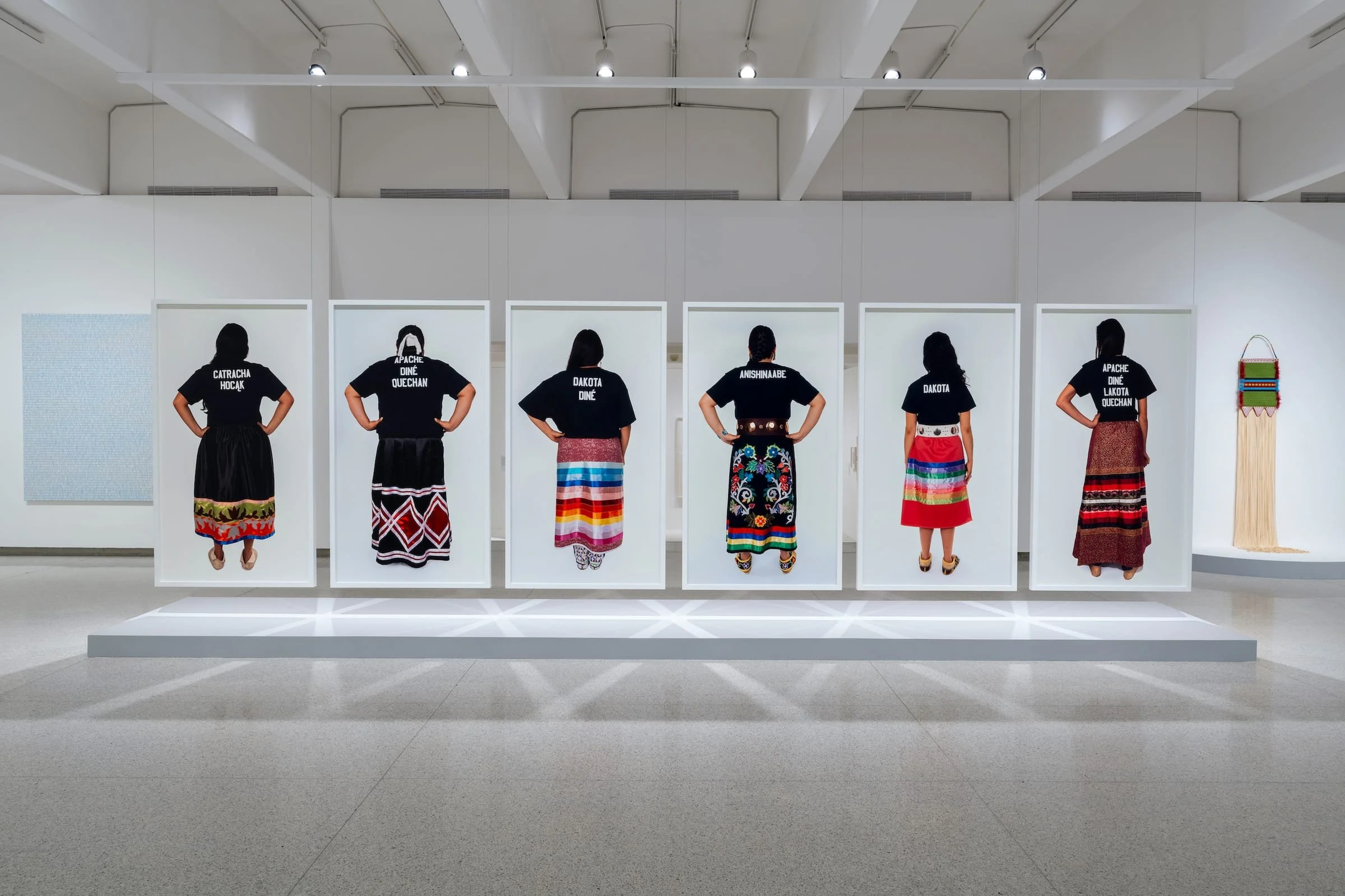 Installation view of Dyani White Hawk: Love Language at the Walker Art Center. Pictured: back view of "I Am Your Relative" (2020)