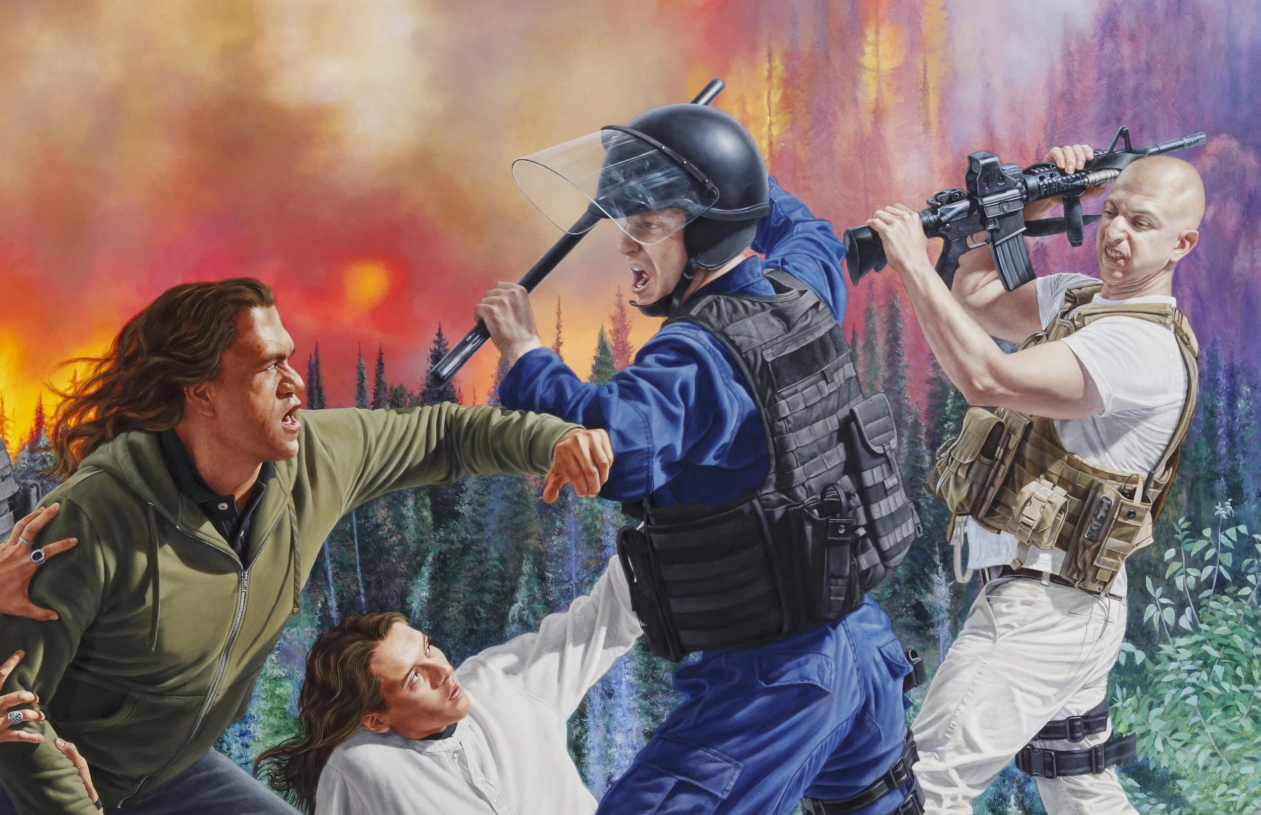 Large-scale acrylic painting of Indigenous men and women fighting against police, protecting nature, controlled burn